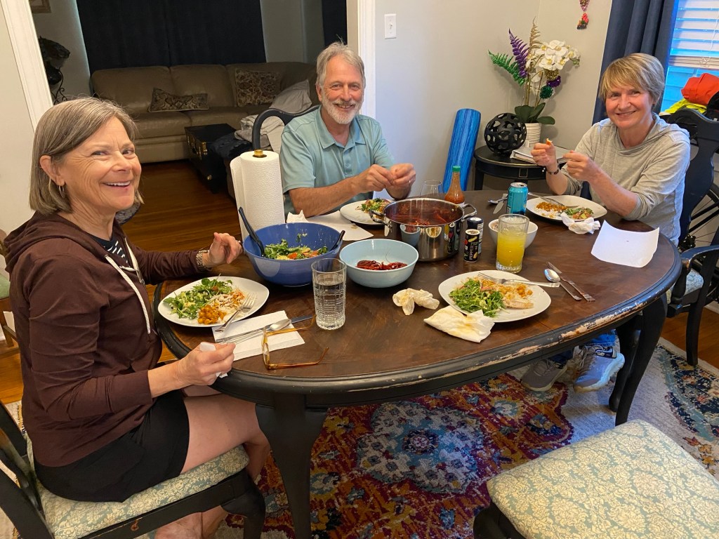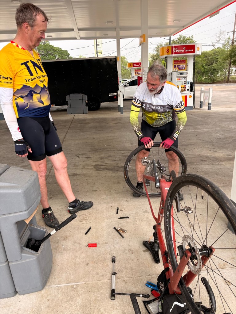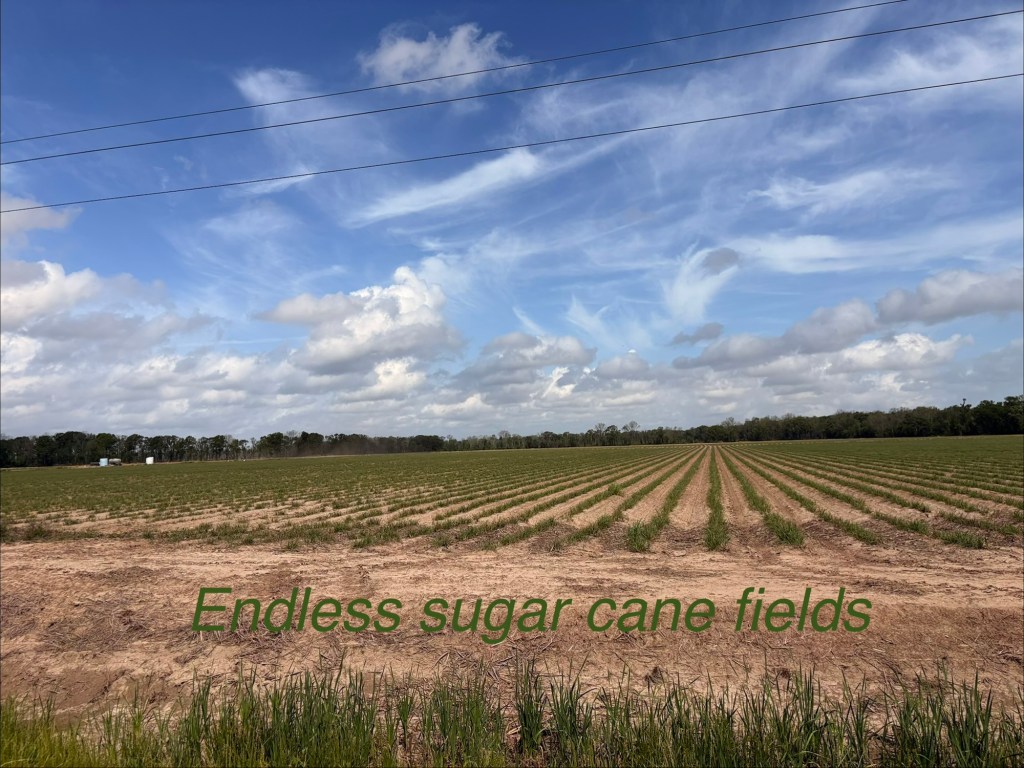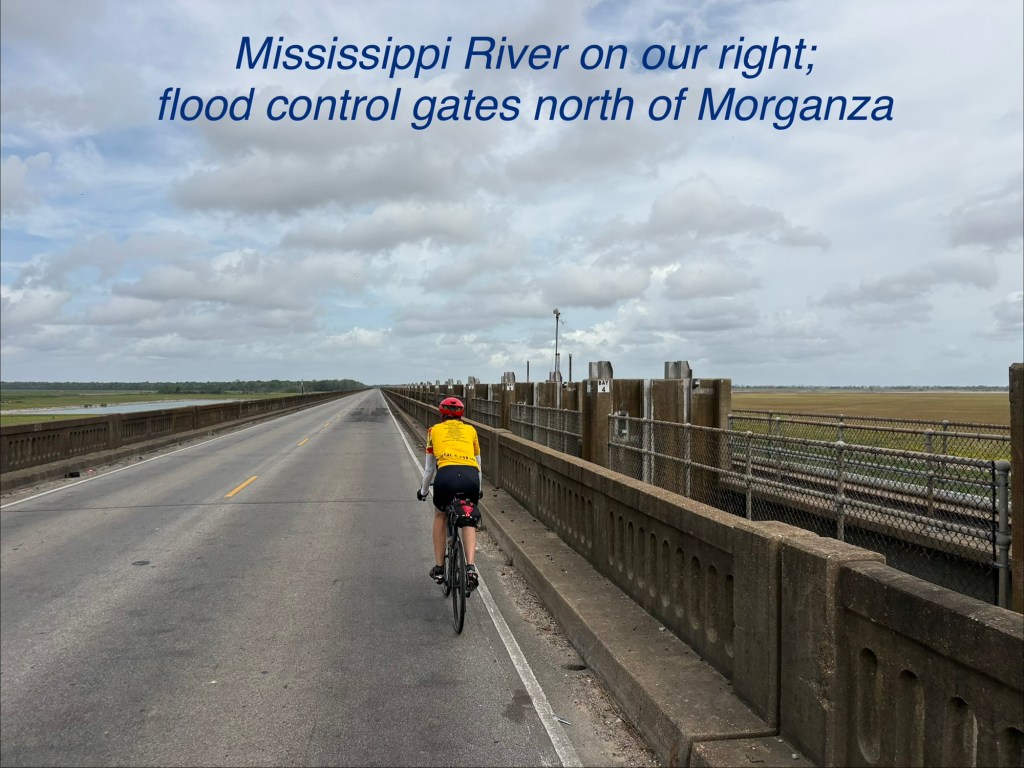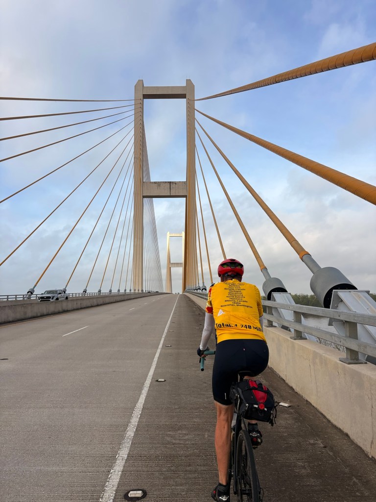 Thankfully mostly cool and mostly advantageous S wind today. Still quite humid with thunderstorms all around. Sadly one of the least fun days on a TransAm ever. The first 20 miles was the most unpleasant 20 miles of the trip so far leaving Baton Rouge on “scenic Hwy” 61 – horrible road surface, tons of debris, tons of industry. One highlight was crossing big John James Audubon Bridge over the Mississippi River! We’ve been near or along it for quite while. Good bye for now as we head west! Finally at mile 57 a lovely country road west of the Mississippi river into Simmesport with mostly a tailwind, but that only lasted about 18 miles. Then we turned on another equally bad road for 10 miles with cracks every 5-10’! We did cut off some mileage during the day by not taking a few suggested loops and stayed on the main highway. Then finally in Cottonport, 12 miles from our destination, and after 91.4 miles, 994’ elevation and off and on cloudbursts with lots of rain, I had a flat tire…. again! Crappy roads will sure do it. Brand new tube was faulty with a split in it! Didn’t have any more with us and started pouring again! I called it quits at the gas station where we had taken refuge… it was called “Y-Not Stop”! Figured that was message enough for me! Boys continued on. Jody came to my rescue… again. Thanks Jody!! Boys finished with 103 miles. We are in the very small town of Bunkie, LA in a very 2 star motel for 2 nights. My aches and pains are lessening, but my upper left leg and hip looks about the same deep purple as the LSU Tiger colors!!