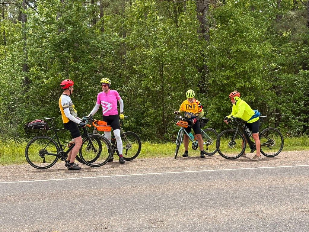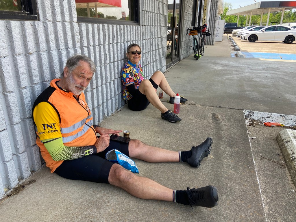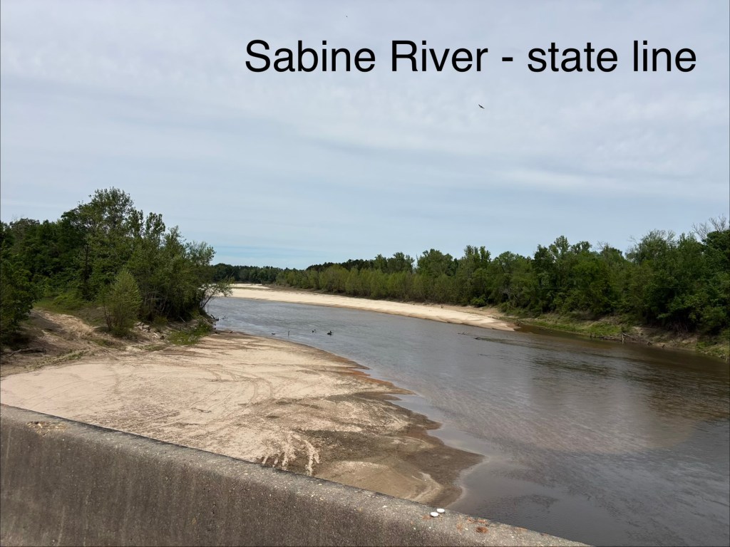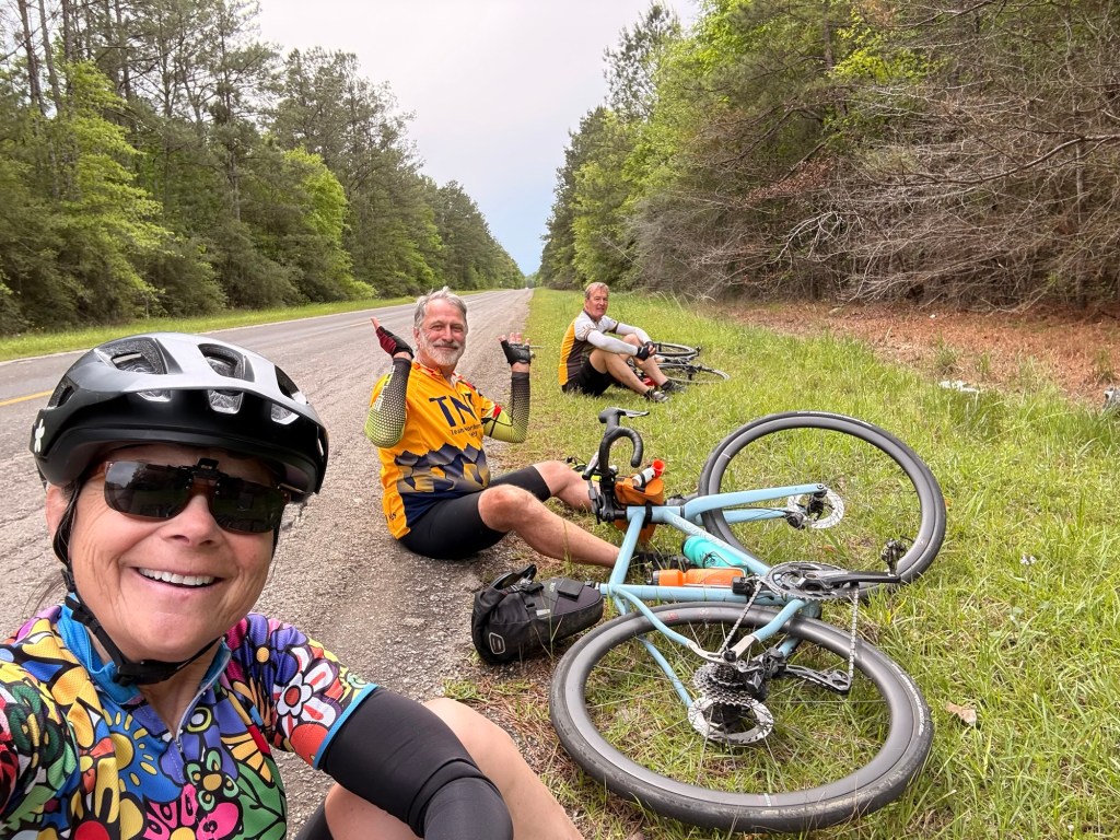 Happy Easter today and Passover earlier this week. Huge storm all last night but it cleared for us to cycle this morning. Saw a lot of pine plantations today and no crawfish ponds. N/NE wind was not too bad in our W/NW direction, even with a tailwind a few times when we turned south (!), and Sunday morning always has less traffic. For a SW Louisiana highway kind of day, the shoulders were mostly wide and clean! 403.8 miles in LA & approx 3500‘ elevation gain. [I sat out one 75 mile day and cut short another day by 12 miles.]