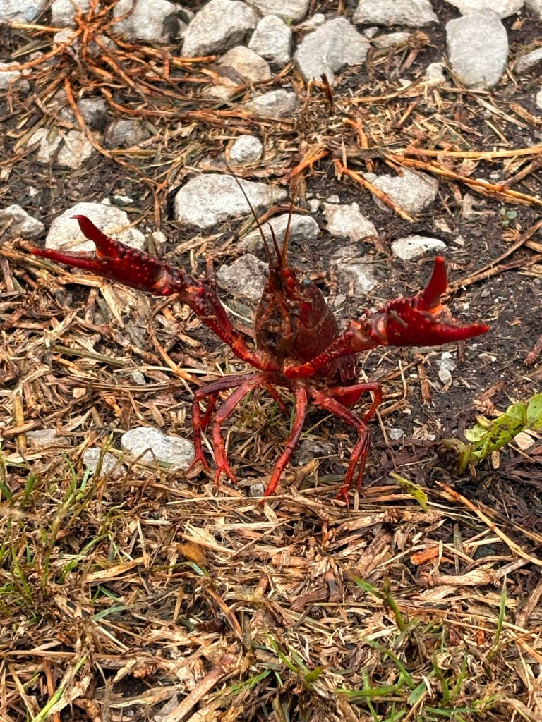 A crawfish in the driveway taking a stand!
