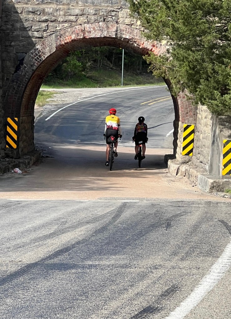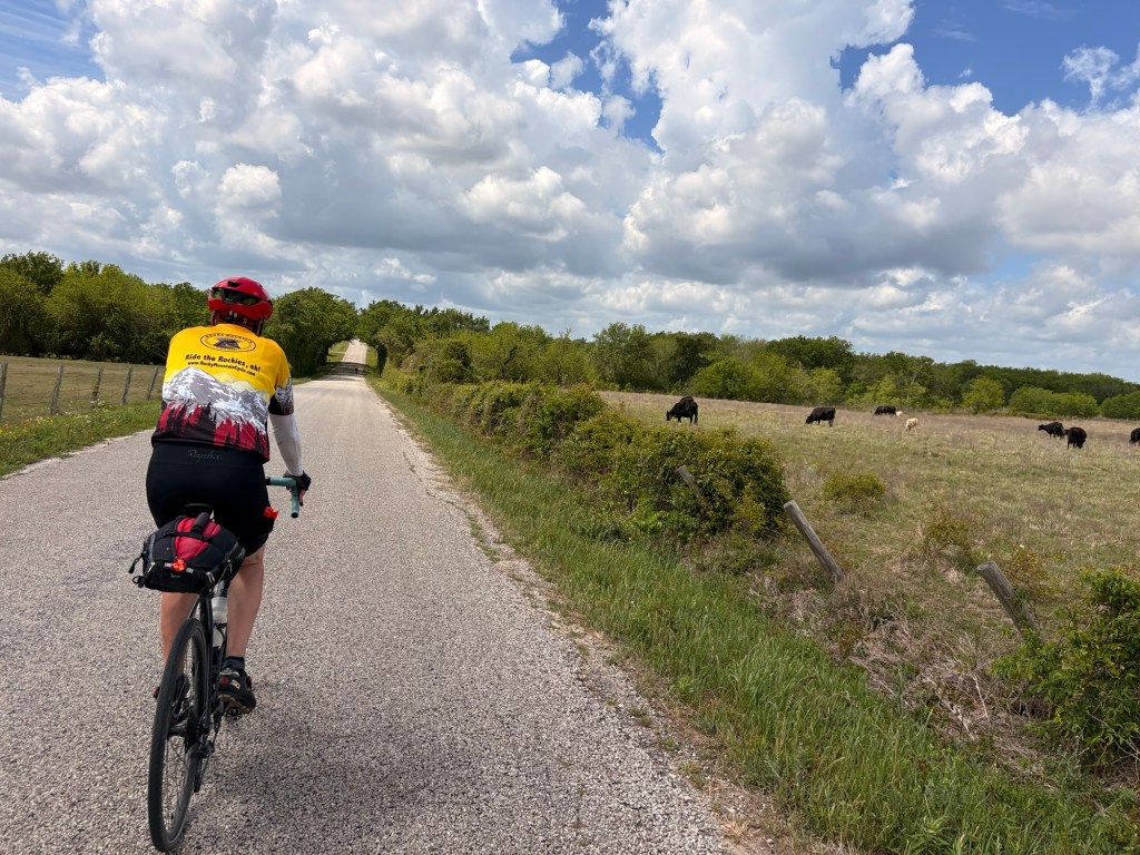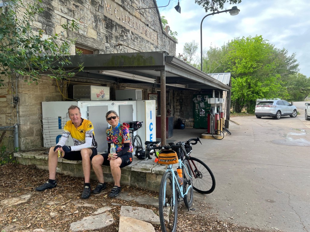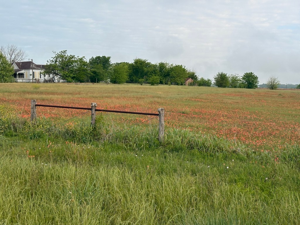 Southeasterly mostly favorable winds and cloud cover kept the temps reasonable. 77.8 miles & 3350’ with a stellar TransAm kind of day, in stark contrast to yesterday! Only two sections of busy highways with decent enough shoulders and then country roads, some without even line markings. Lots of ranches with amazing entry gates. Tom took photos of many. Lots of American flags and Texas flags flying at the same height. Wildflowers are prime!! Incredible live oak trees and some gorgeous juniper-like trees. And a few cute, small historic towns like Independence, Burton (with the oldest still operating cotton gin) and Round Top. Made it into LaGrange, TX before a downpour! 😊