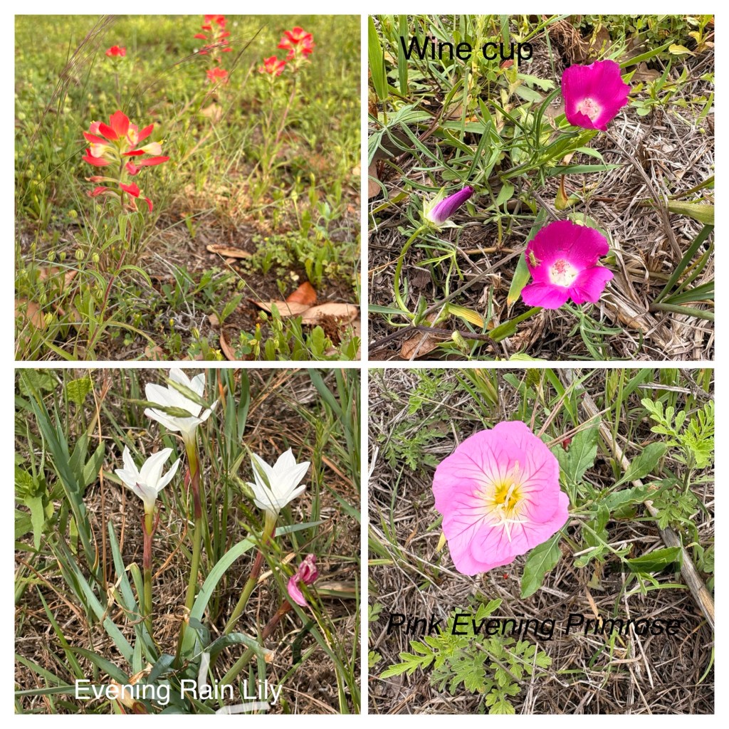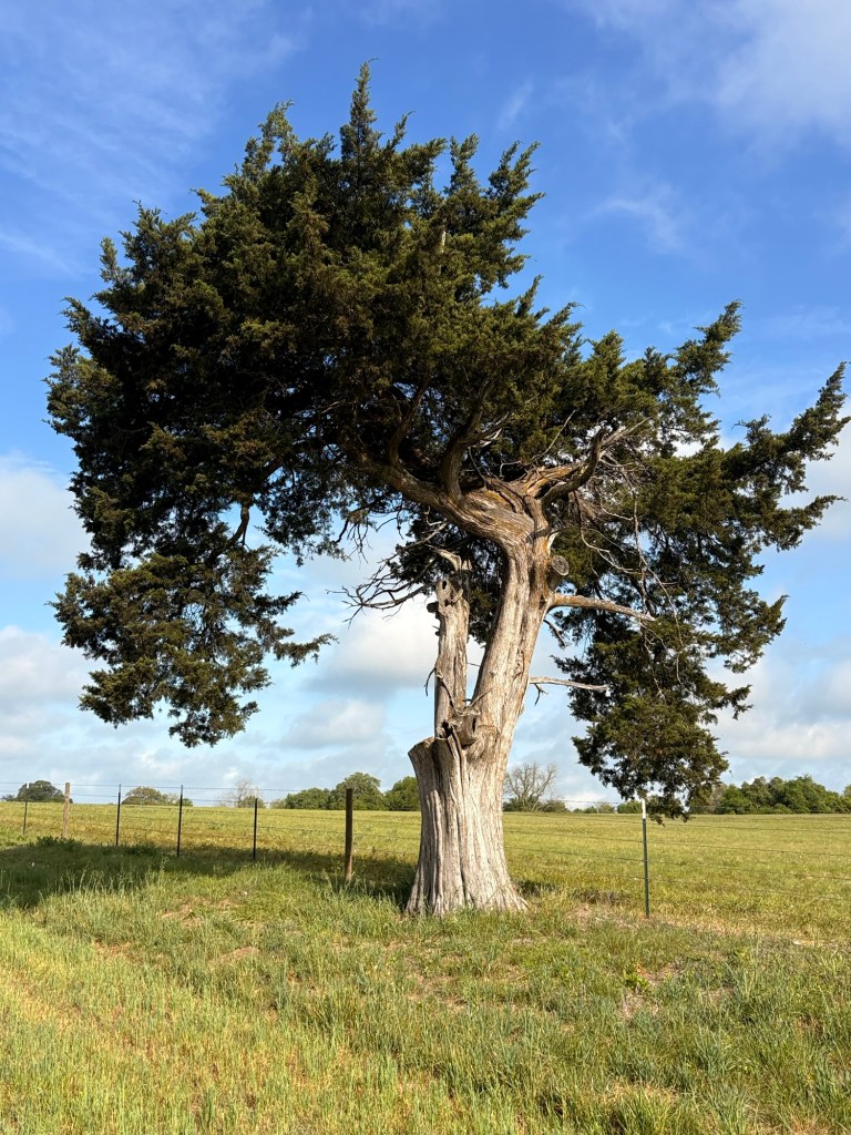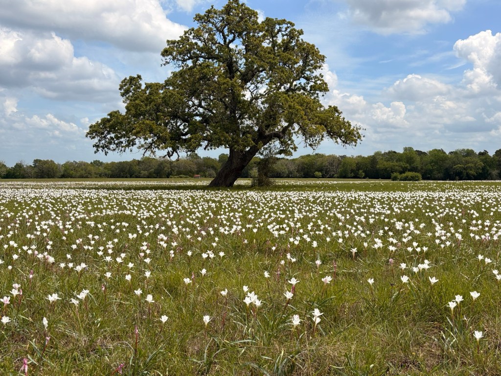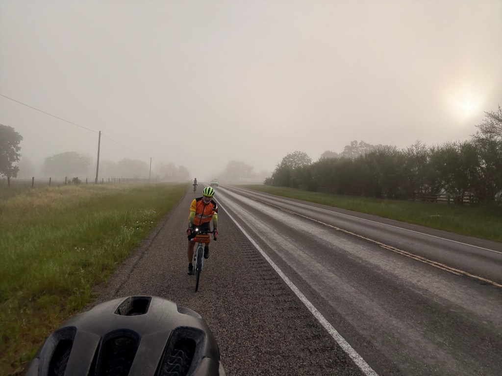 Southeasterly mostly favorable winds and cloud cover kept the temps reasonable. 77.8 miles & 3350’ with a stellar TransAm kind of day, in stark contrast to yesterday! Only two sections of busy highways with decent enough shoulders and then country roads, some without even line markings. Lots of ranches with amazing entry gates. Tom took photos of many. Lots of American flags and Texas flags flying at the same height. Wildflowers are prime!! Incredible live oak trees and some gorgeous juniper-like trees. And a few cute, small historic towns like Independence, Burton (with the oldest still operating cotton gin) and Round Top. Made it into LaGrange, TX before a downpour! 😊