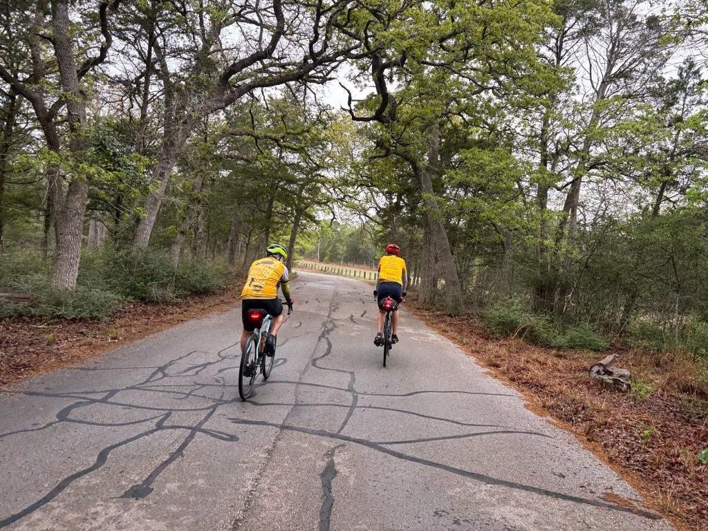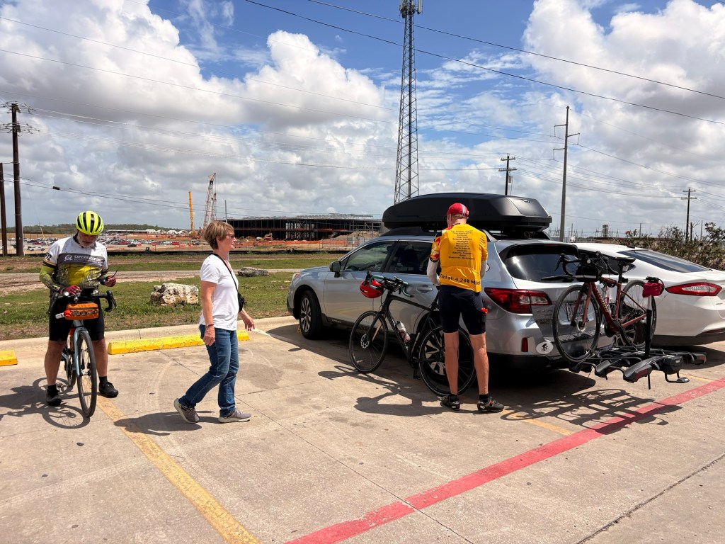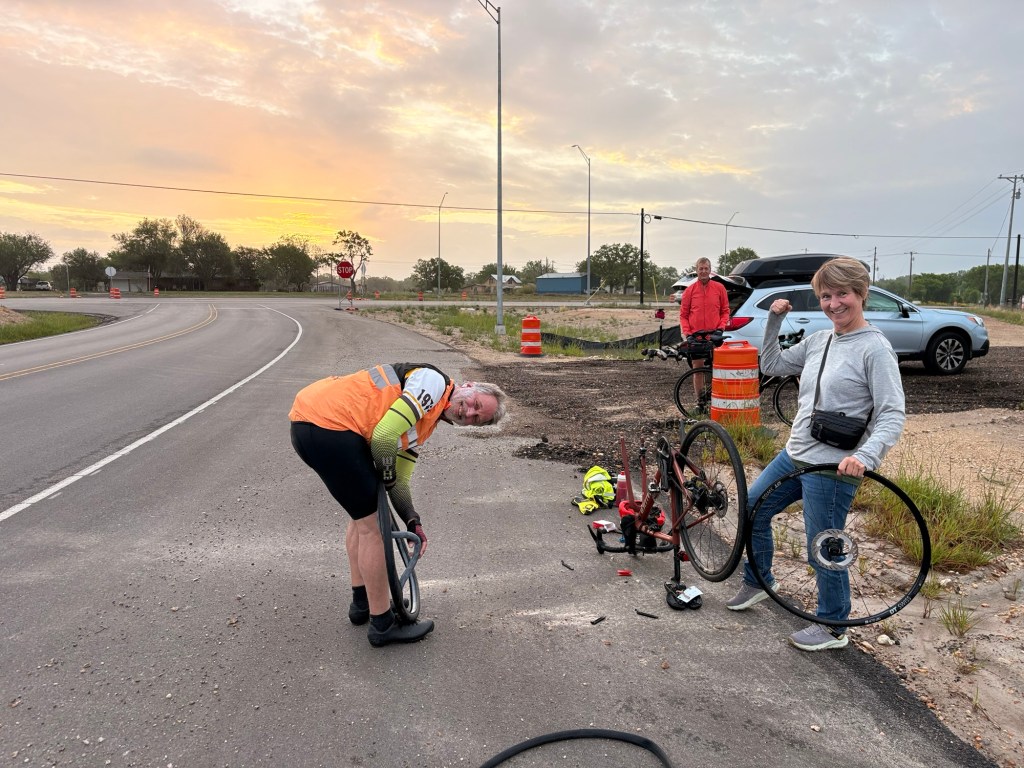 This morning Jody drove us 6 miles north from LaGrange back to the route up the large highway with construction that we cycled yesterday. As we were unloading shortly after 7am, I noticed I had a fourth flat tire! 😩 This time on the front, and the culprit was another very tiny metal wire from a road sweeper or a steel belted radial remnant! Quick fix again with Steven’s help and on the road again. The first 38 miles were generally lovely country roads and 13 miles were in Buescher & Bastrop State Parks with some steep rollers, great road surfaces, no dogs and no traffic. But then the roads changed to no shoulder and lots of traffic with huge distribution/data center construction, and I called it quits! Jody had been graciously checking on us several times during the day, so I called it a day and hopped in! The boys of course kept going into downtown Austin. 53.4 miles 2326’ (boys 72.1 & 2800’)