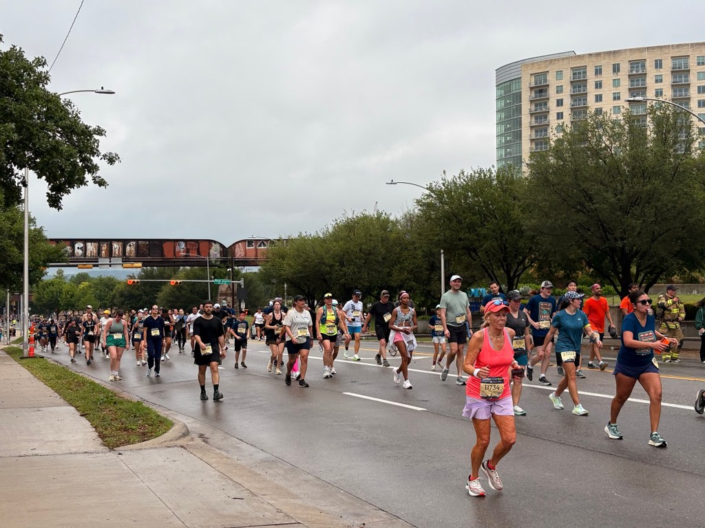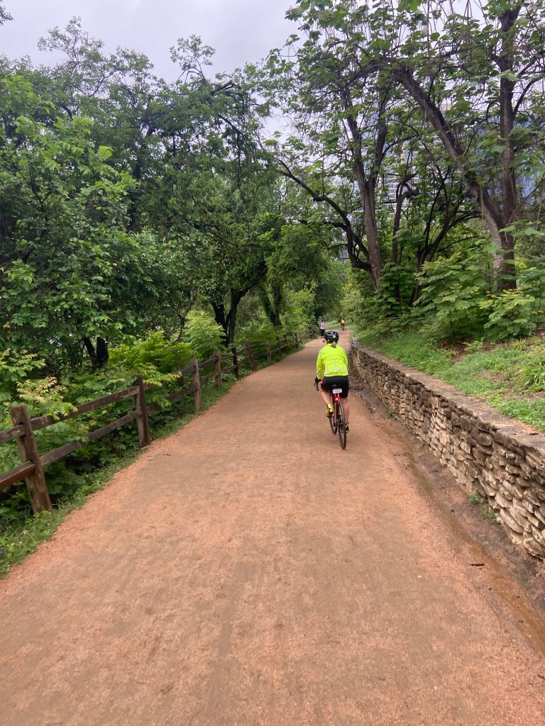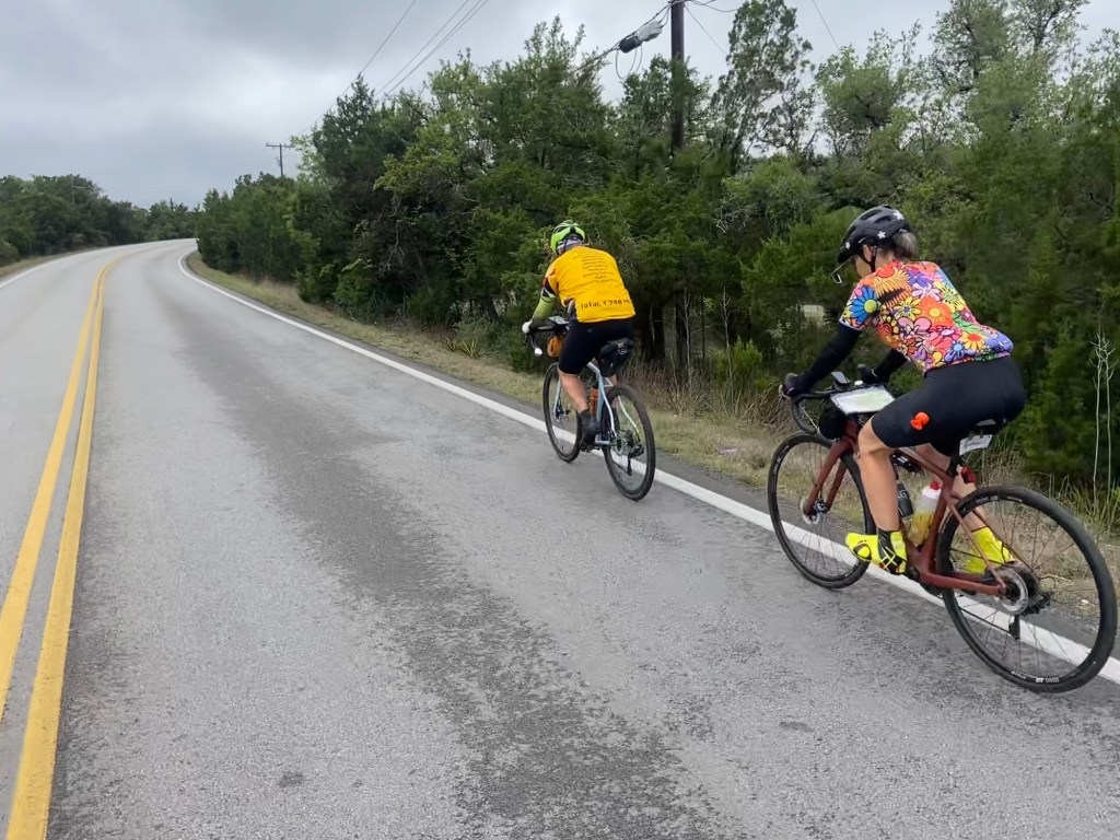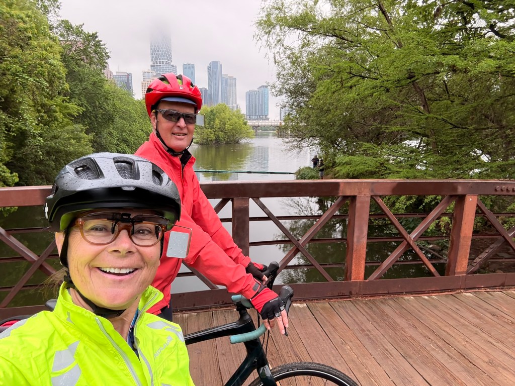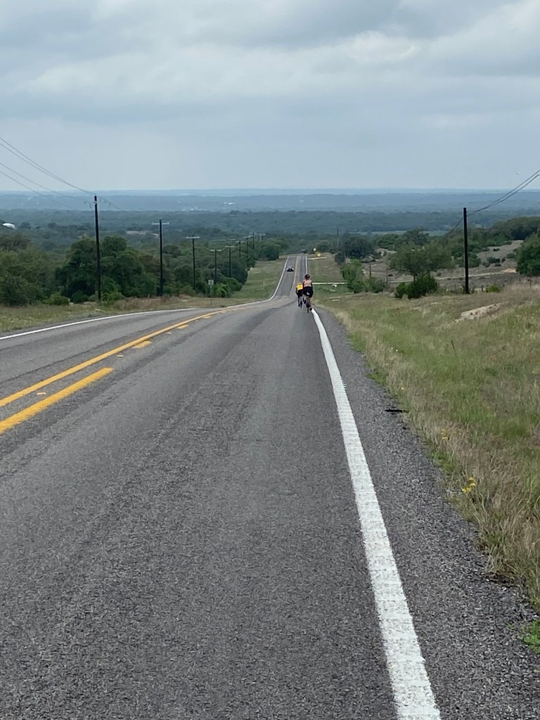 In addition to the storms, the Cap10, the largest running event in Texas, was happening in downtown Austin with 25,000 runners! We spent quite a bit of time yesterday evaluating our planned route cycling out of town due to the event’s conflicting running route. But in the end Louise Joy, my college mate, assured us that taking the riverfront path west out of town would be no problem. And that’s how it went! Fun to see the miles and miles of runners/walkers but always slow navigating into and out of big cities.