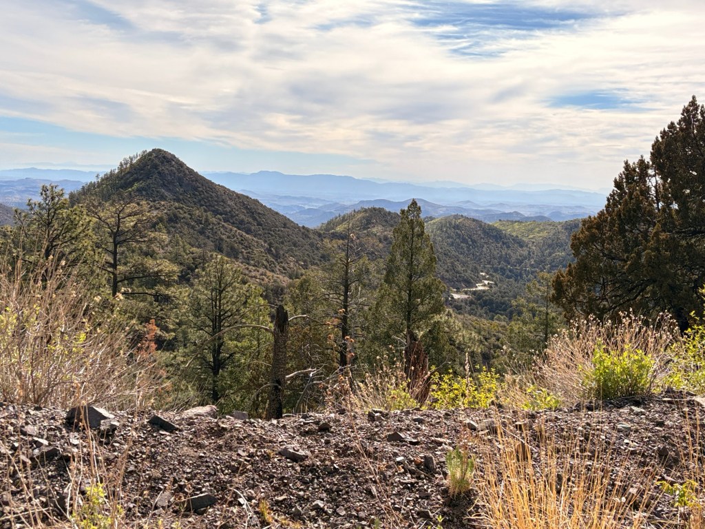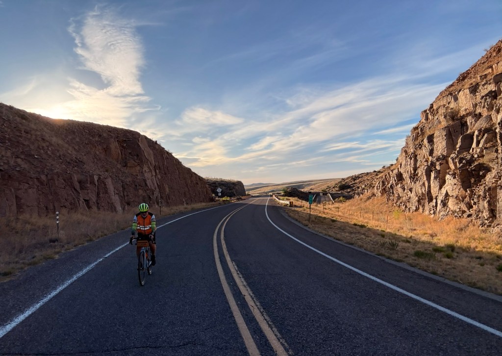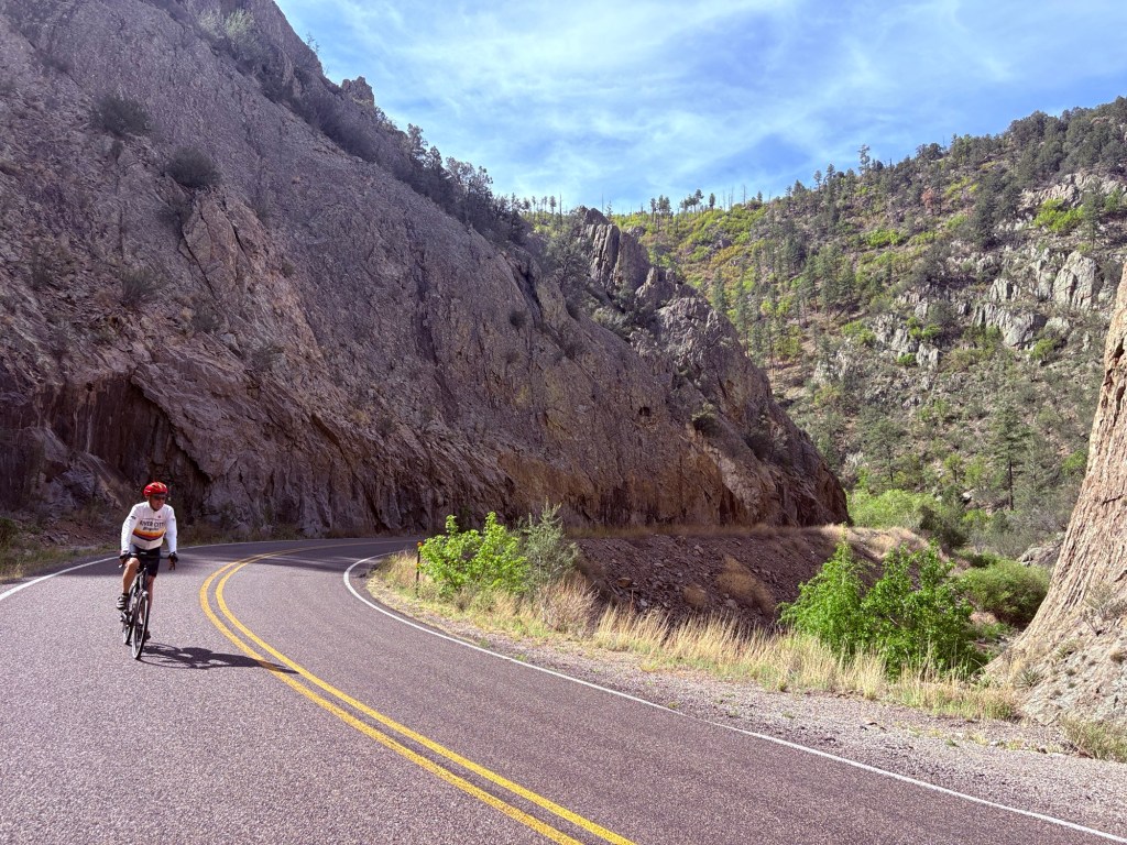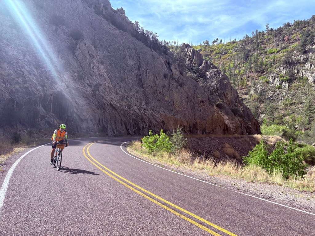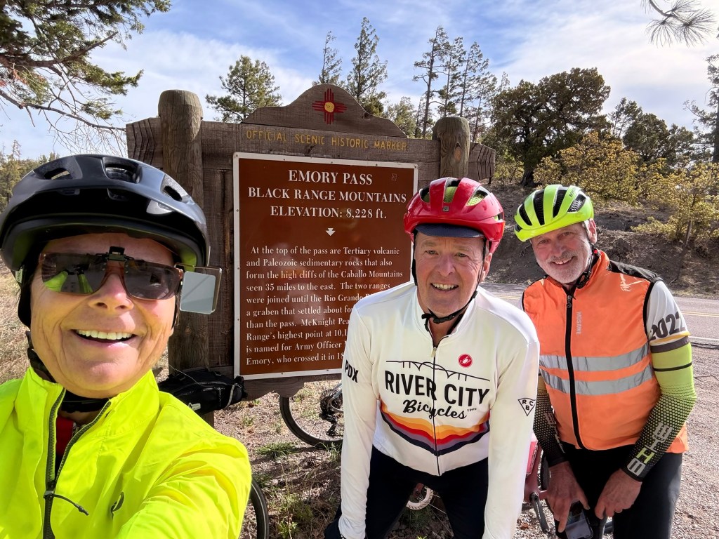 Started at 7am this morning at an elevation of 5280’ in Hillsboro where we spent a quiet night cooking in. Started climbing west on hwy 152 to Emory Pass at 8228’, the highest point on the Southern Tier. It was a chilly start at 52 degrees, but we were climbing up the Percha Creek drainage. For a point of comparison for my cycling friends, Larch Mountain in the Columbia River Gorge is approx. 3100’ in 14 miles. We cycled 16.6miles to the summit – 2900’ above Hillsboro. Then we had some rollers down the west side of the Black Mtns to finally reach the Mimbres River Valley. The geology and variety of rocks was amazing. Turned north again up that valley to our Airbnb where Jody met us. 46.2 miles 4160’ for a big gorgeous day made more challenging with some N & NW wind.