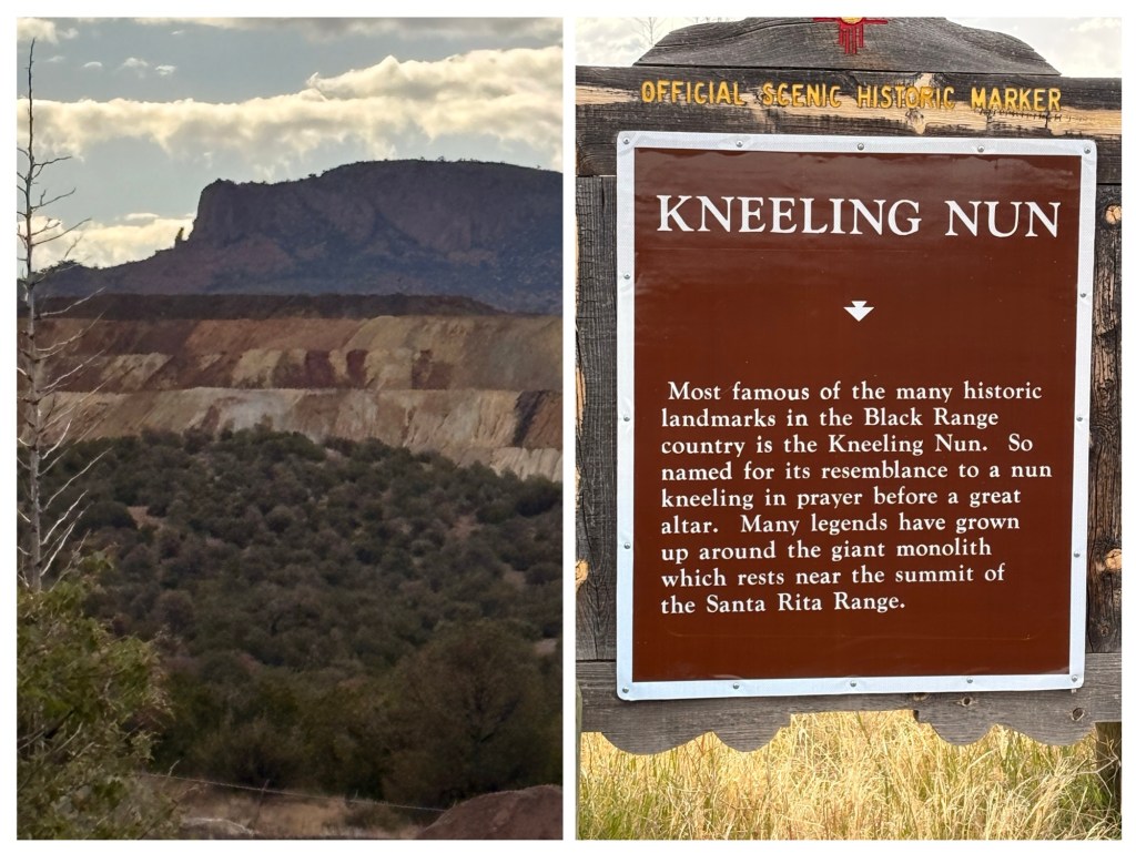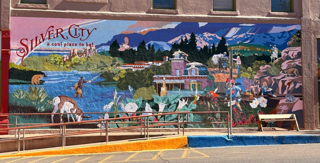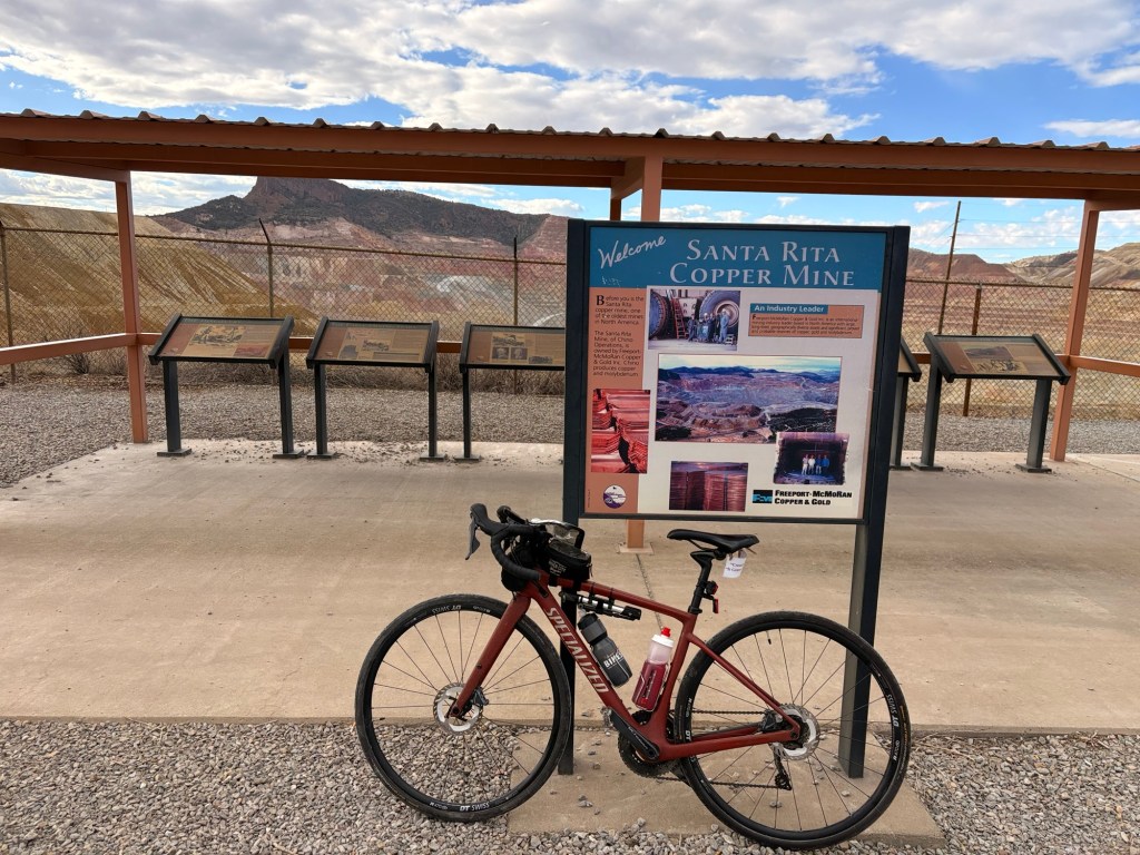 Today at 7am and a temp of 45 degrees, Jody drove us back south to the junction of hwys 35 & 152 from where we cycled yesterday. We cycled on west through Hanover seeing the massive 100+ year old Santa Rita open pit copper mine and later the bustling town of Silver City. Hilly and beautiful mountain road on a Sunday morning. After a fabulous cappuccino and yummy quiche in Silver City, we decided to cycle on and see how the 20+mph S/SW head wind with gusts above 40mph would feel. We all called it a ride after a few miles down Hwy 90 in the tiny hamlet of Tyrone (yes, again Hwy 90 and again gusty dangerous wind!) Short day at 27.8 miles 2228’ All other conditions were exceptional – road surface, Sunday morning, cool temps, bikes and bodies functioning well. But sadly no need to push on in these winds. Tomorrow is another opportunity to cycle. Thanks Jody for the pick up! We drove to our destination of Lordsburg with even bigger winds and increasingly dust-filled skies, and are hoping if the winds are less tomorrow as forecast, we will drive back to Tyrone and cycle what we missed and then some! Stay tuned!